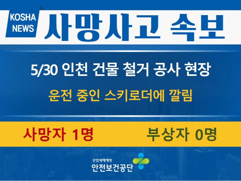 정보마당 재해 사례 재해 사례 [5/30, 인천] 스키로더에 깔림 페이지 정보 작성자 : 웹관리자 조회수 : 6,200회 작성일 : 22-06-02 본문 ※ 위 내용은 신고 및 현재 파악된 내용으로 조사결과에 따라 변경될 수 있음.출처 : 한국산업안전보건공단 (www.kosha.or.kr) 목록 이전글[6/1, 광양] 크레인의 인양물이 탈락되어 맞음 22.06.02 다음글[5/30, 함안] 공장 내 화재·폭발 사고 22.06.02