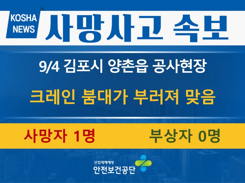[9/4, 김포] 크레인 붐대가 부러져 맞음 페이지 정보 작성자 : 웹관리자 조회수 : 5,511회 작성일 : 22-09-06 본문 ※ 위 내용은 신고 및 현재 파악된 내용으로 조사결과에 따라 변경될 수 있음.출처 : 한국산업안전보건공단 (www.kosha.or.kr) 목록 이전글[9/5, 오산] 사다리에서 작업 중 떨어짐 22.09.06 다음글[9/3, 성남] 생명줄 설치 중 떨어짐 22.09.06