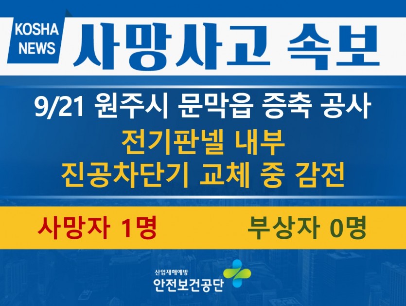 [9/21, 원주] 전기판넬 내부 진공차단기 교체 중 감전 페이지 정보 작성자 : 웹관리자 조회수 : 5,751회 작성일 : 22-09-26 본문 ※ 위 내용은 신고 및 현재 파악된 내용으로 조사결과에 따라 변경될 수 있음.출처 : 한국산업안전보건공단 (www.kosha.or.kr) 목록 이전글[9/21, 서울] 작업 중 떨어짐 22.09.26 다음글[9/18, 홍천]예초작업 중 벌에 쏘임 22.09.21