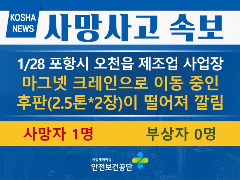 [1/28, 포항] 크레인으로 이동 중인 자재가 떨어져 깔림 페이지 정보 작성자 : 웹관리자 조회수 : 4,855회 작성일 : 23-01-31 본문 ※ 위 내용은 신고 및 현재 파악된 내용으로 조사결과에 따라 변경될 수 있음.출처 : 한국산업안전보건공단 (www.kosha.or.kr) 목록 이전글[1/28, 부산] 고소작업차에서 작업 중 떨어짐(7m) 23.01.31 다음글[1/26, 광양] 신호작업 중 레미콘 차량과 충돌 23.01.30