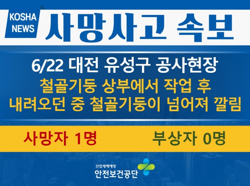 [6/22, 대전] 철골기둥 상부에서 작업 후 내려오던 중 철골기둥이 넘어져 깔림 페이지 정보 작성자 : 웹관리자 조회수 : 3,799회 작성일 : 23-06-26 본문 ※ 위 내용은 신고 및 현재 파악된 내용으로 조사결과에 따라 변경될 수 있음.출처 : 한국산업안전보건공단 (www.kosha.or.kr) 목록 이전글[6/22, 서울] 스프링클러 설치 작업 중 무게추가 작업발판을 들어올려 벽과 끼임 23.06.26 다음글[6/20, 홍천] 코킹작업 중 떨어짐 23.06.21