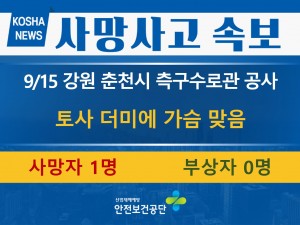 정보마당 재해 사례 재해 사례 게시판 검색 276 [9/18, 홍천]예초작업 중 벌에 쏘임 2022-09-21 275 [9/17, 광양]채광창을 밟고 떨어짐 2022-09-19 274 [9/16, 창원]천장크레인과 기둥 사이 끼임 2022-09-19 273 [9/15, 인천]작업발판에서 떨어짐 2022-09-16 272 [9/15, 춘천]무너지는 토사더미에 가슴 맞음 2022-09-16 271 [9/14, 태백]죽탄에 휩쓸려 사망 2022-09-16 270 [9/14, 고성]배관과 배관 사이에 끼임 2022-09-16 269 [9/14, 광양]호퍼에서 떨어진 후 하부 게이트에 끼임 2022-09-15 268 [9/13, 군포] 굴착기 전도되어 깔림 2022-09-15 267 [9/9, 제주] 고소작업차에서 작업 중 떨어짐 2022-09-13 266 [9/8, 군산] 천장크레인으로 상차작업 중인 자재(환봉)에 맞음 2022-09-13 265 [9/7, 서울] 유류탱크에서 떨어짐 2022-09-08 264 [9/7, 부산] 떨어지는 유리에 맞음 2022-09-08 263 [9/5, 부산] 회전하는 임펠러에 끼임 2022-09-08 262 [9/5, 오산] 사다리에서 작업 중 떨어짐 2022-09-06 처음 이전 열린21페이지 22페이지 23페이지 24페이지 25페이지 26페이지 27페이지 28페이지 29페이지 30페이지 다음 맨끝 검색 검색대상 제목내용제목+내용글쓴이글쓴이(코) 검색어 필수 검색 닫기