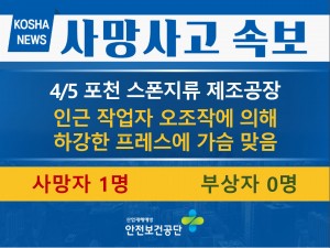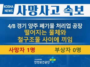 정보마당 재해 사례 재해 사례 게시판 검색 126 [4/8, 서울] 움직이는 차량과 벽 사이 끼임 2022-04-11 125 [4/8, 양주] 철구조물에 끼임 2022-04-11 124 [4/8, 사천] 넘어지는 나무에 깔림 2022-04-11 123 [4/7, 광양] 작업발판 틈새로 떨어짐 2022-04-11 122 [4/7, 강릉] 굴착기 버켓에 머리 끼임 2022-04-11 121 [4/6, 과천] 장비와 철골빔 사이 끼임 2022-04-11 120 [4/6, 김해] 지게차 넘어져 깔림 2022-04-08 119 [4/6, 천안] 폭발에 의해 저장탱크 상부에서 떨어짐 2022-04-07 118 [4/5, 인천] 리프트에서 떨어짐(4m) 2022-04-07 117 [4/5, 포천] 하강하는 프레스에 가슴 맞음 2022-04-06 116 [4/5, 진천] 이송기계에 머리 끼임 2022-04-06 115 [4/4, 광양] 떨어진 중량물에 깔림 2022-04-05 114 [4/4, 부산] 떨어진 사각봉에 맞음 2022-04-04 113 [4/3, 안동] 지붕 위에서 작업 중 떨어짐 2022-04-04 112 [4/2, 음성] 넘어지는 탱크에 부딪힘 2022-04-04 처음 이전 열린31페이지 32페이지 33페이지 34페이지 35페이지 36페이지 37페이지 38페이지 39페이지 맨끝 검색 검색대상 제목내용제목+내용글쓴이글쓴이(코) 검색어 필수 검색 닫기