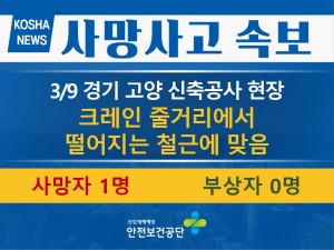 정보마당 재해 사례 재해 사례 게시판 검색 81 [3/14, 고성] 엘리베이터 개구부로 떨어짐 2022-03-16 80 [3/14, 남해] 해상에서 선박 뒤집힘 2022-03-15 79 [3/13, 서울] 떨어지는 전선드럼에 맞음 2022-03-14 78 [3/12, 창원] 콘크리트피트 아래로 떨어짐 2022-03-14 77 [3/10, 김포] 믹싱기 날개에 끼임 2022-03-11 76 [3/9, 고양] 굴착기 넘어지면서 부딪힘 2022-03-10 75 [3/9, 고양] 떨어지는 철근에 맞음 2022-03-10 74 [3/8, 김제] 굴삭기 넘어짐 2022-03-10 73 [3/8, 양산] 아파트 옥상에서 작업 준비중 미끄러져 떨어짐 2022-03-10 72 [3/8, 창녕] 무너지는 토사 및 콘크리트에 근로자 깔림 2022-03-08 71 [3/8, 대전] 아파트 발코니에서 작업 중 떨어짐 2022-03-08 70 [3/7, 화성] 넘어지는 지게차에 깔림 2022-03-08 69 [3/7, 춘천] 넘어지는 적재물에 깔림 2022-03-08 68 [3/5, 천안] 떨어지는 금형에 맞음 2022-03-07 67 [3/5, 포항] 안전난간대 간 틈 사이로 떨어짐 2022-03-07 처음 이전 31페이지 32페이지 33페이지 열린34페이지 35페이지 36페이지 37페이지 38페이지 39페이지 맨끝 검색 검색대상 제목내용제목+내용글쓴이글쓴이(코) 검색어 필수 검색 닫기
