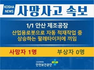 정보마당 재해 사례 재해 사례 게시판 검색 6 [1/10, 대구] 말비계에서 떨어짐 2022-01-18 5 [1/10, 김해] 지게차와 쇼트기 사이에 끼임 2022-01-18 4 [1/8, 평택] 변압기 철거 중 전원에 접촉되어 감전 2022-01-18 3 [1/5, 홍성] 충전부에 접촉되어 감전 2022-01-18 2 [1/5, 남양주] 스프링클러 배관 압력 확인 중 떨어짐 2022-01-18 1 [1/1, 안산] 상승하는 팔레타이저에 끼임 2022-01-18 처음 이전 31페이지 32페이지 33페이지 34페이지 35페이지 36페이지 37페이지 38페이지 열린39페이지 검색 검색대상 제목내용제목+내용글쓴이글쓴이(코) 검색어 필수 검색 닫기