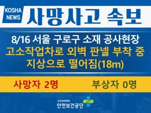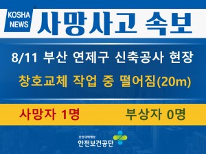 정보마당 재해 사례 재해 사례 게시판 검색 486 [8/19, 논산] 작업발판 위에서 지붕 기와 교체 작업 중 떨어짐(높이 7.2m) 2023-08-22 485 [8/18, 강릉] 떨어지는 벌도목에 맞음 2023-08-22 484 [8/16, 서울] 고소작업차로 외벽 판넬 부착 중 지상으로 떨어짐(18m) 2023-08-21 483 [8/16, 수원] 사다리차 작업대가 비계를 충격하여 비계 위에 있던 작업자가 떨어짐 2023-08-21 482 [8/14, 부산] H빔 하역 중 H빔과 함께 떨어져 깔림 2023-08-16 481 [8/14, 평택] 제품 보관창고로 이동하던 중 진입하던 지게차에 부딪혀 깔림 2023-08-16 480 [8/11, 부산] 창호 교체 작업 중 떨어짐(20m) 2023-08-14 479 [8/9, 용인] 옥상(20층) 배수로 점검 작업 중 떨어짐 2023-08-14 478 [8/9, 안성] 콘크리트 타설 작업 중 거푸집이 붕괴되어 매몰 2023-08-14 477 [8/7, 합천] 작업 후 이동 중이던 덤프트럭에 신호수가 부딪힘 2023-08-08 476 [8/3, 서울] 지하 전기실 양수 작업 중 물(수심 2m)에 빠진 상태로 발견 2023-08-07 475 [8/3, 인천 서구] 자재 운반 작업 중 넘어지면서 철근에 찔림 2023-08-07 474 [8/2, 강원 강릉] 옹벽 비계 해체 작업 중 떨어짐(10m) 2023-08-04 473 [8/2, 광주] 크레인으로 폐관 하역 작업 중 떨어지는 폐관에 맞음 2023-08-04 472 [8/1, 보령] 타이어롤러를 운전하여 이동 중 롤러와 함께 수로로 떨어짐(2.5m) 2023-08-02 처음 1페이지 2페이지 3페이지 4페이지 5페이지 6페이지 열린7페이지 8페이지 9페이지 10페이지 다음 맨끝 검색 검색대상 제목내용제목+내용글쓴이글쓴이(코) 검색어 필수 검색 닫기