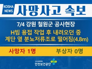 정보마당 재해 사례 재해 사례 게시판 검색 456 [7/11, 인천] 가시설 띠장 해체 작업 중 떨어짐(높이 5m) 2023-07-12 455 [7/10, 청송] 임도 개설 작업 중 임도 일부가 붕괴되어 굴착기 전도 2023-07-12 454 [7/6, 김포] 철골 위에서 볼트체결 작업 후 고소작업대로 이동하던 중 떨어짐(15m) 2023-07-10 453 [7/6, 서울] 수배전반 주변 바닥 도색 준비 중 유도전류에 의해 감전 2023-07-10 452 [7/6, 청주] 갱폼 인상을 위해 고정볼트 해체 중 갱폼이 탈락하면서 함께 떨어짐(50m) 2023-07-07 451 [7/5, 대구] 기계(정련기) 내부의 원단을 꺼내던 중 동료 작업자가 기계를 작동시켜 끼임 2023-07-07 450 [7/4, 의정부] 콘크리트 타설용 장비(CPB)를 지지하던 슬래브가 파손되며 무너진 CPB에 깔림 2023-07-06 449 [7/4, 철원] H빔 용접 작업 후 내려오던 중 계단 옆 분뇨저류조에 떨어짐(4.8m) 2023-07-06 448 [7/3, 영암] 선박블럭 적재 선반 해체 작업 중 떨어짐(2.2m) 2023-07-06 447 [7/2, 남해] 옥상 누수 점검 작업 중 건물 바닥으로 떨어짐(8m) 2023-07-05 446 [6/27, 안양] 창틀 도장 작업 중 2층 계단 단부에서 계단참으로 떨어짐 2023-07-04 445 [6/26, 용인] 컨테이너 위에서 줄걸이 작업을 하던 중 바닥으로 떨어짐(2.6m) 2023-07-04 444 [6/27, 함평] 수문 점검 및 부유물 제거 작업 중 하천으로 떨어짐(2.5m) 2023-07-03 443 [6/27, 성남] CT촬영실 베드 유압모터 점검 중 낙하하는 베드와 바닥사이에 끼임 2023-06-28 442 [6/26, 인천] 특장차 적재함 아래에서 수리 작업 중 적재함에 깔림 2023-06-27 처음 1페이지 2페이지 3페이지 4페이지 5페이지 6페이지 7페이지 8페이지 열린9페이지 10페이지 다음 맨끝 검색 검색대상 제목내용제목+내용글쓴이글쓴이(코) 검색어 필수 검색 닫기